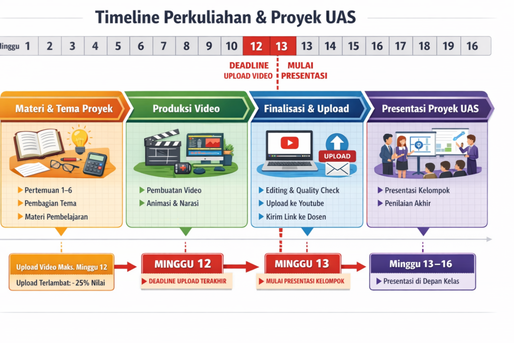 Bagian ini menegaskan kapan materi dipelajari, kapan proyek disiapkan, kapan upload, dan kapan presentasi dimulai.
