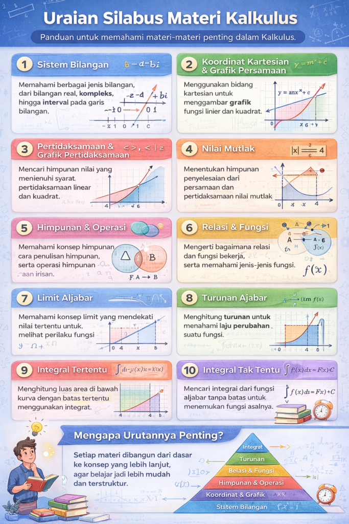 Kalkulus dibangun bertahap dari konsep dasar sampai kalkulus inti. Mahasiswa mempelajari sistem bilangan, grafik, pertidaksamaan, himpunan, relasi dan fungsi, lalu masuk ke limit, turunan, dan integral. Di akhir, ada proyek UAS berbentuk video pembelajaran interaktif.